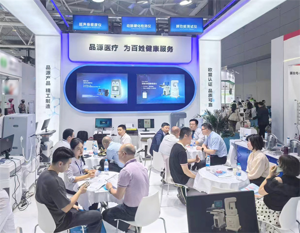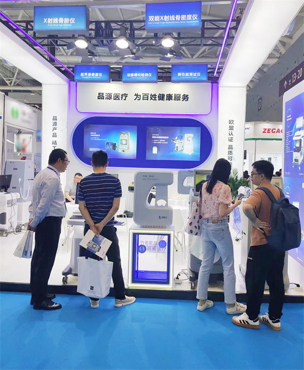在這場醫療科技的盛宴中,品源醫療以其非凡的創新實力和精湛品質,成為了展會中的一顆璀璨明珠。此次展出的雙能X射線骨密度儀、超聲骨密度檢測儀、X射線骨齡儀、動脈硬化檢測儀以及肺功能測試儀系列產品,憑借著檢測精準,人性化的設計理念以及舒適、便捷的檢測體驗,吸引了眾多國內外客商和專業人士的目光。